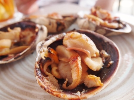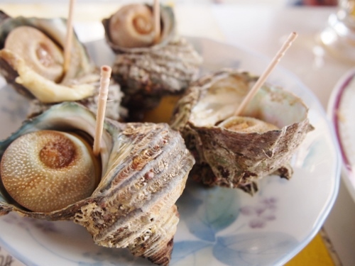 サザエのツボ焼きと大アサリの網焼きを、海を眺めながら・・・・