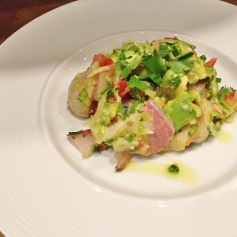 ブリの燻製と奏トマト、有機アボカドの前菜サラダ