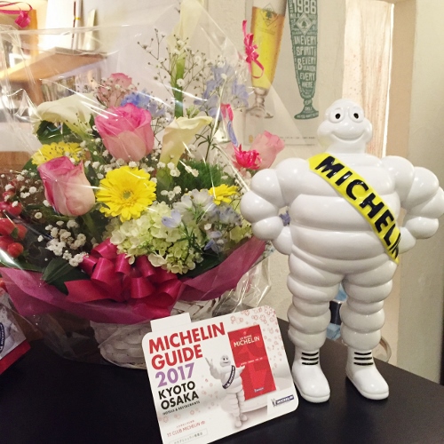 ご近所のヘアサロンのお店からミシュラン掲載のお祝いでお花をいただきました。