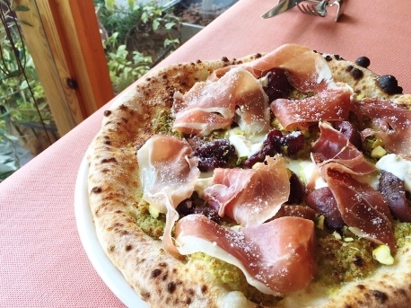 パルマ産生ハムといちじくのコンポートの自家製ピスタチオソースのピザ