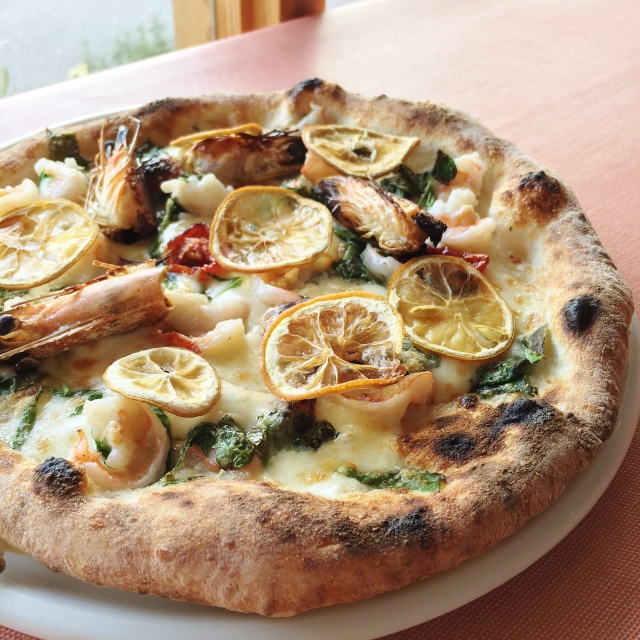 天使えびと有機アボカド、レモンの自家製アンチョビソースのピザ