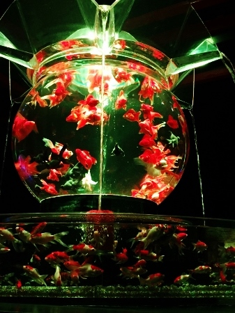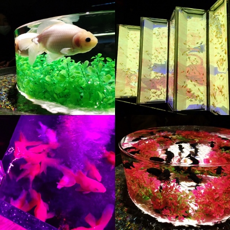 美しい光の演出によって金魚が妖艶に浮かび上がり、その暗闇の背景とのコントラストに