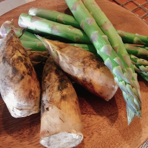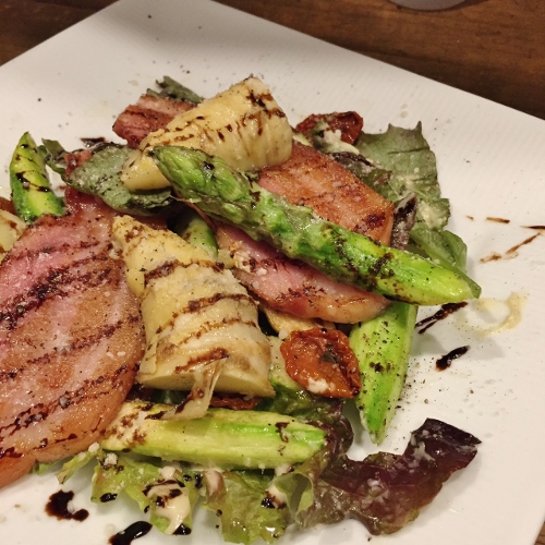 徳島の筍とグリーンアスパラ、熟成ベーコンのグリルのサラダ仕立て