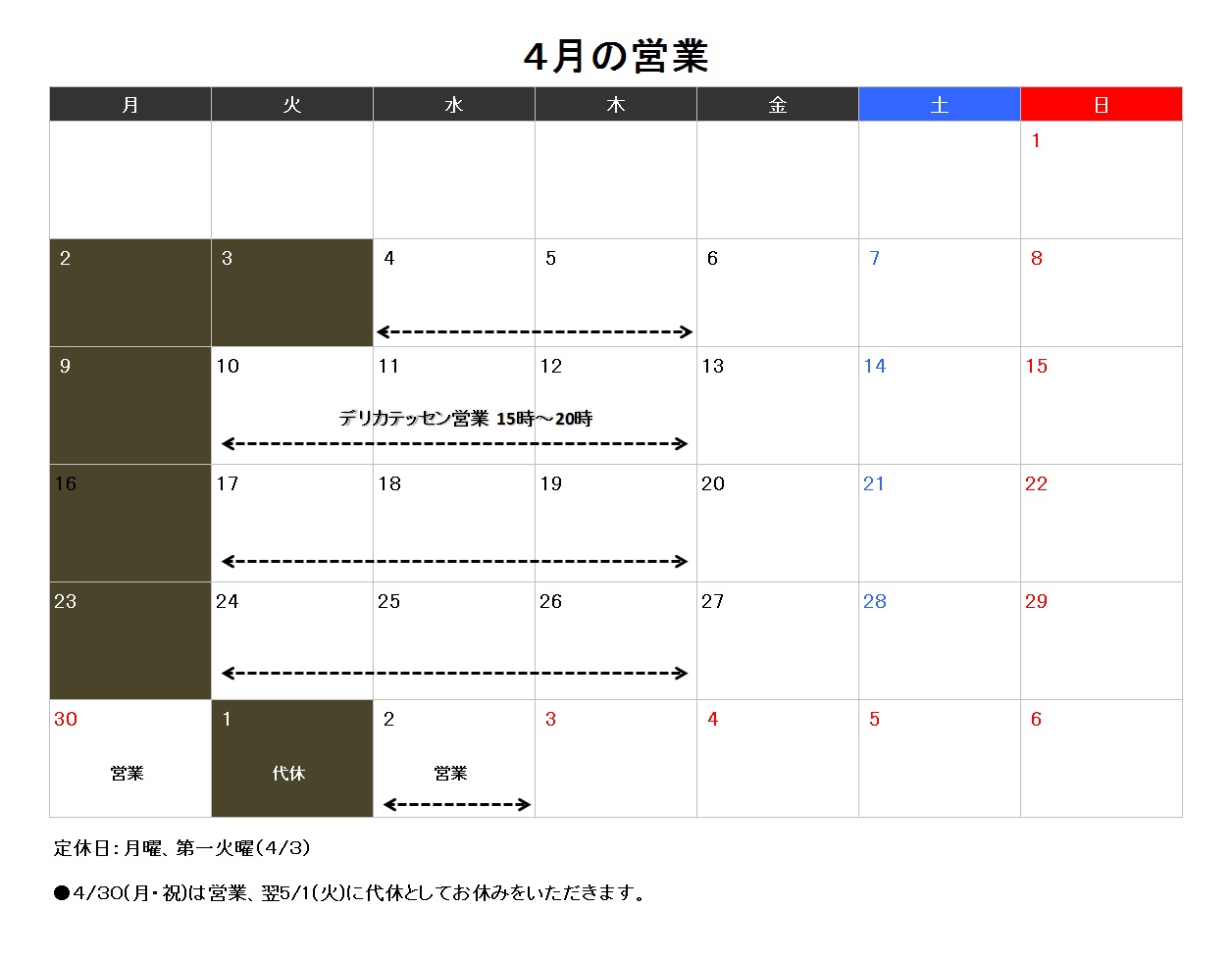 30日(月・祝)は営業、翌5月1日(火)は代休でお休みをいただきます。